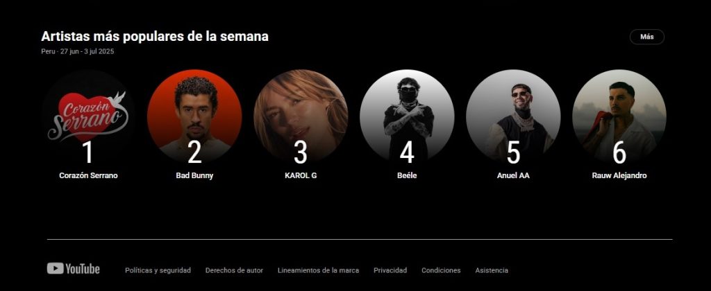 Este ranking no se fija en si una canción es nueva o antigua. Si suma muchas vistas durante la semana, entra en la lista. Es una forma de ver qué temas siguen siendo populares con el tiempo.