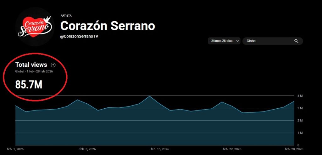 Total de reproducciones de Corazón Serrano en febrero de 2026
